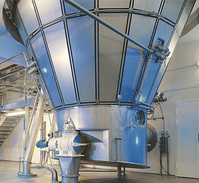 采用高速離心式霧化裝置,但也可以選用二流體噴嘴將溶液及漿料霧化;