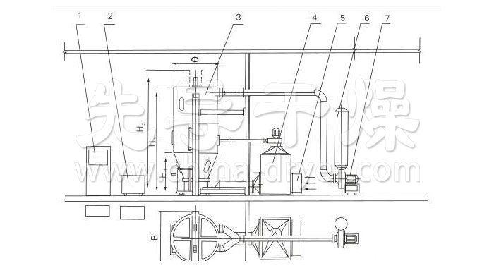PGL系列噴霧干燥制粒機(jī)工作過程為料液通過隔膜泵高壓輸入,噴出霧狀液滴,然后同熱空氣并流下降,大部分粉粒由塔底排料口收集,廢氣及其微小粉末經(jīng)旋風(fēng)分離器分離,廢氣由抽風(fēng)機(jī)排出,粉末由設(shè)在旋風(fēng)分離器下端的授粉筒收集,風(fēng)機(jī)出口還可裝備二級(jí)除塵裝置,回收率在96-98%以上.